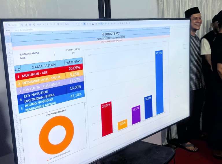 PEKANBARU (RA) – Pasangan calon Wali Kota dan Wakil Wali Kota Pekanbaru, Agung Nugroho dan Markarius Anwar (AMAn), mencatatkan keunggulan signifikan dengan 47,10% suara dalam Pilkada Pekanbaru 2024 berdasarkan hasil quick count yang telah mencakup 100 persen suara.