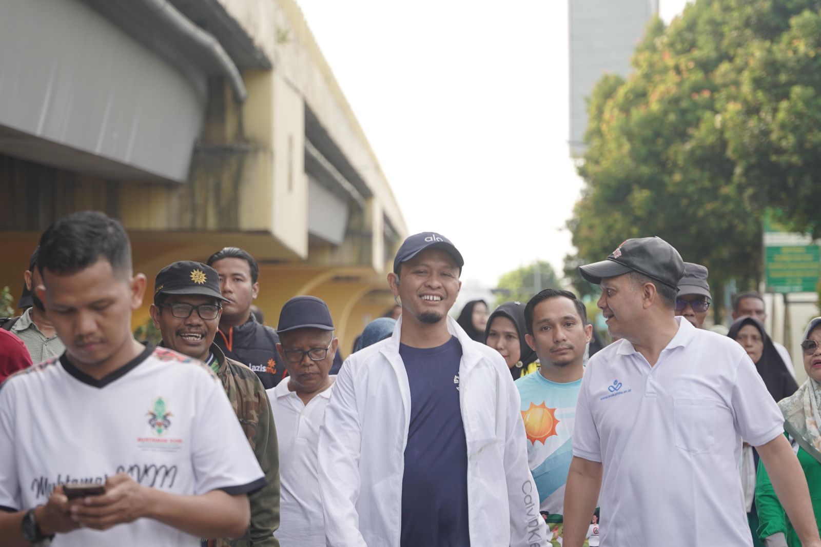 Agung juga menunjukkan dukungannya kepada pelaku UMKM dengan memborong dagangan "es teh keliling" untuk dibagikan secara gratis kepada para peserta jalan sehat.