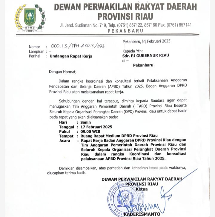 Maka dari itu, melalui surat nomor 000.1/S/PPH.AKD.3/393, DPRD Riau melalui Badan Anggaran (Banggar) akan mengadakan rapat kerja dalam rangka koordinasi dan konsultasi terkait pelaksanaan APBD Tahun 2025, besok, Senin (17/2/2025).