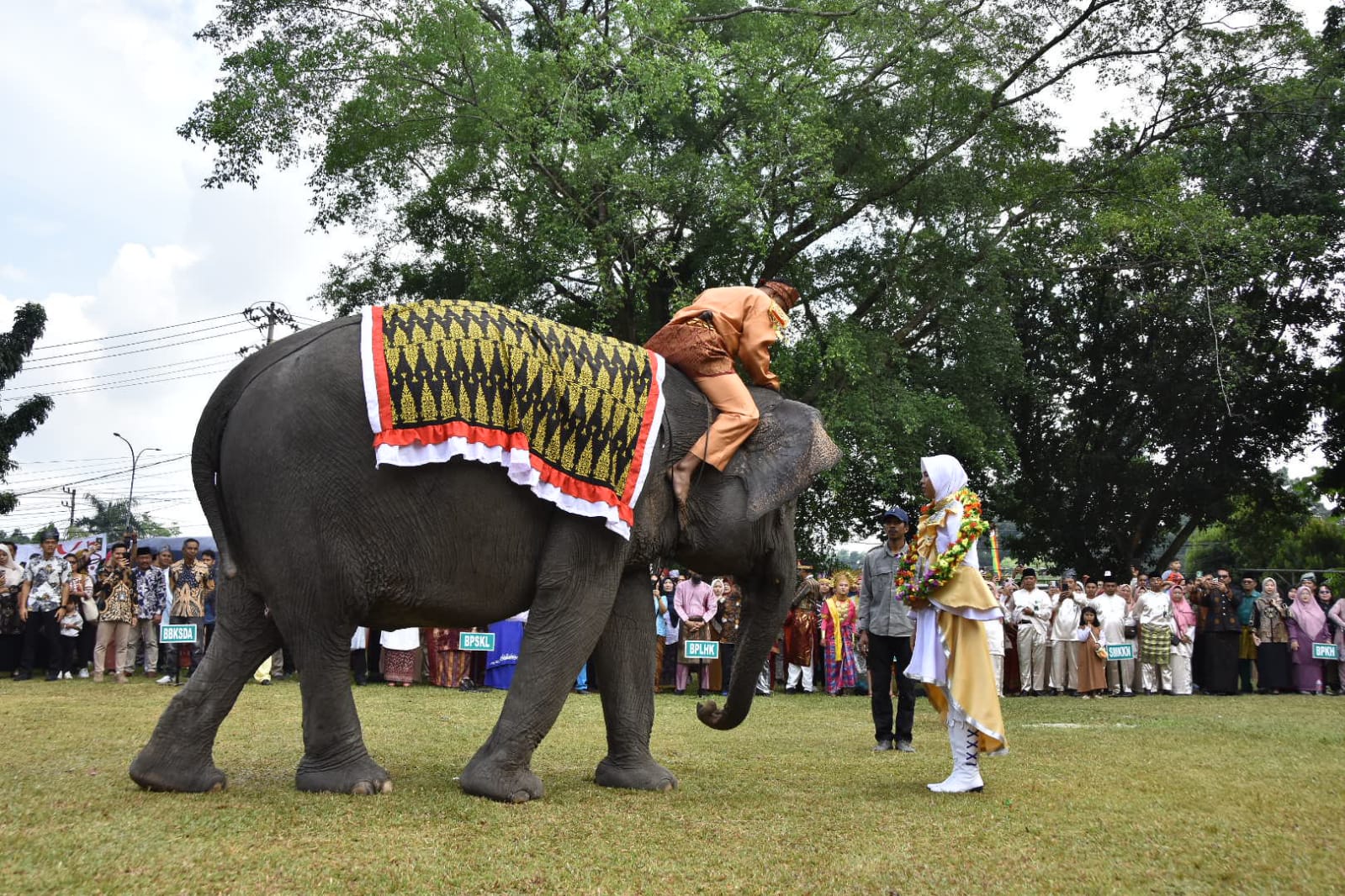 Jovi (45), gajah jantan yang ditunggangi mahout bernama Gono, dan Vera (38), gajah betina yang ditunggangi mahout Ramlan, berjalan perlahan menuju tengah lapangan dengan kain batik bermotif Melayu berhiaskan renda merah putih di punggungnya.