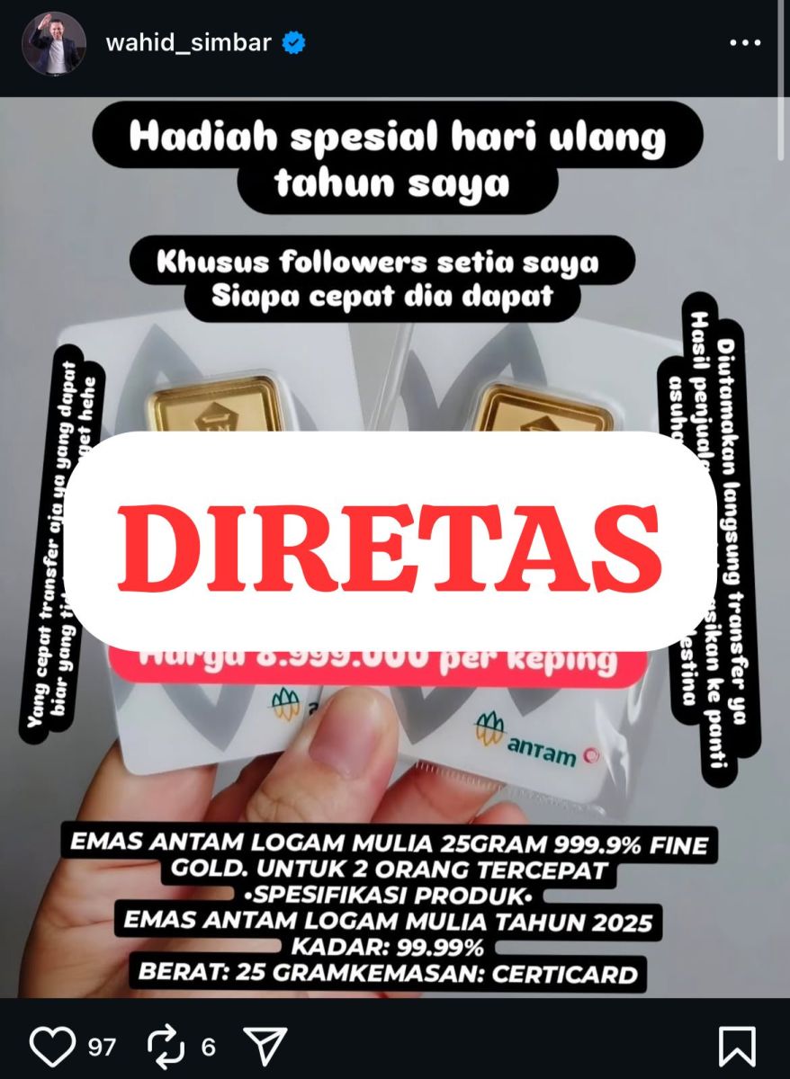 Diketahui, akun Instagram Abdul Wahid dengan unggahan terbarunya menjual emas antam logam mulia 25 gram dengan harga nyaris Rp9 juta per keping.