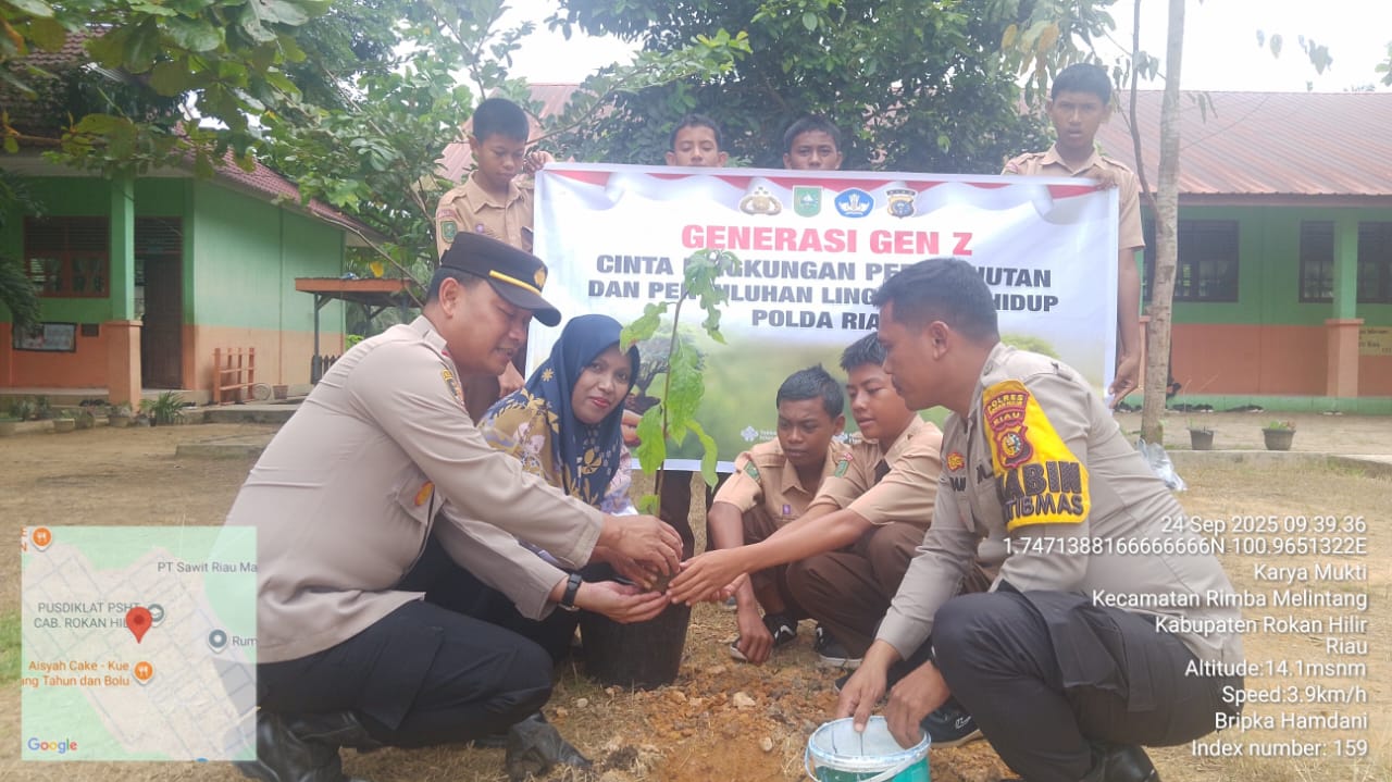 ROHIL (RA) - Polsek Rimba Melintang, Polres Rokan Hilir, melaksanakan kegiatan sosialisasi program Green Policing sekaligus penanaman bibit pohon di lingkungan sekolah, Rabu (24/9/2025).