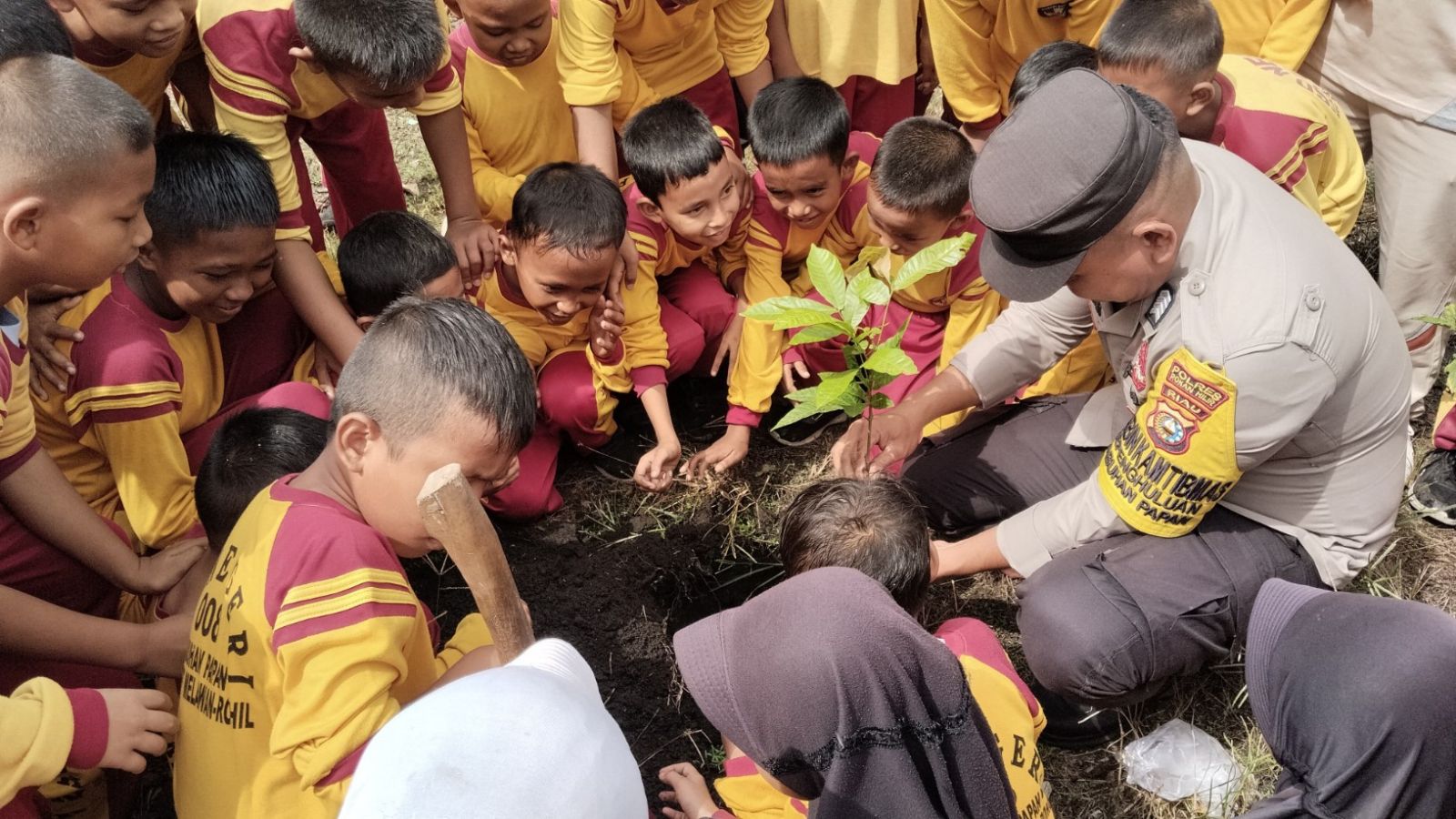 Selain memberikan edukasi, kegiatan dilanjutkan dengan aksi nyata penanaman pohon di halaman sekolah sebagai simbol komitmen Polri dalam menjaga kelestarian lingkungan.