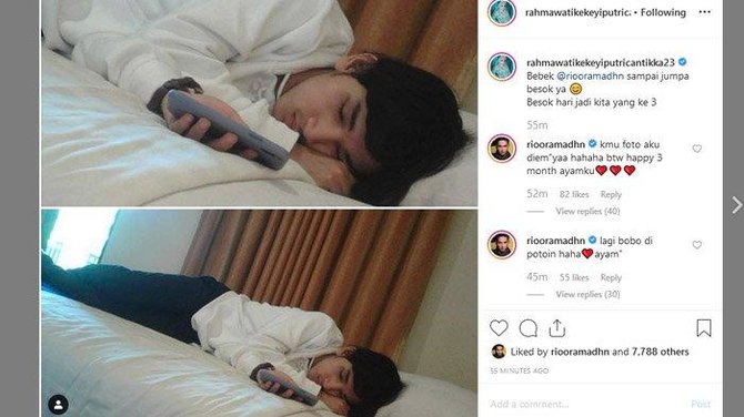 Postingan foto itu dikomentari oleh Rio Ramadhan. Rio Ramadhan menyebut Rahmawati Kekeyi mengambil fotonya diam-diam. Ia memberi ucapan selamat hari jadi kepada pacarnya itu.