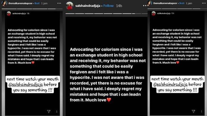 "Next time watch your mouth @salshaindradjaja before you say something!!! ((Lain kali perhatikan ucapanmu sebelum mengatakan sesuatu)," tulis Kareena Kapoor dalam unggahan di instagram story.