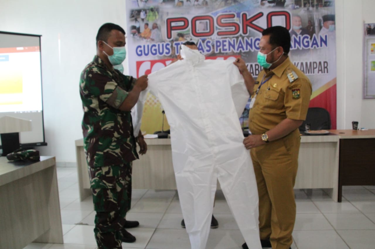 Riauaktual.com - Dinas Kesehatan kabupaten Kampar hari ini mendapatkan bantuan 200 Stel Alat Pelindung Diri (APD) dari prajurit Kodim 0313/Kpr yang diserahkan langsung oleh Dandim 0313/Kpr Letkol Inf Aidil amin S.I.P, M.I.Pol di Aula kantor Dinas Kesehatan kabupaten Kampar, Senin (06/04/2020).