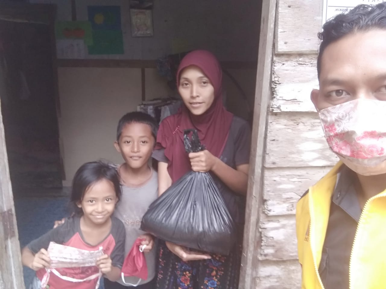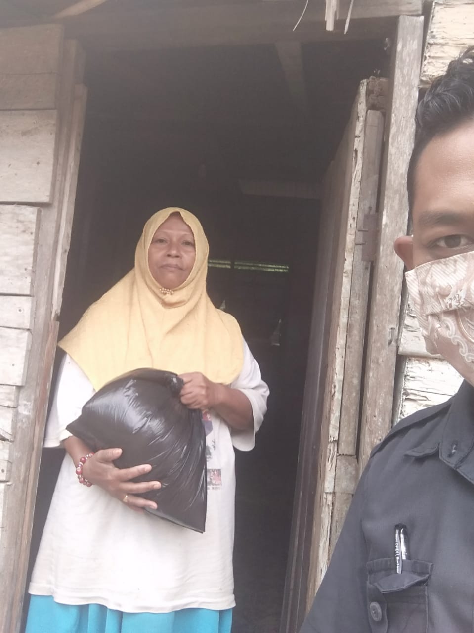 Terlihat masyarakat menerima bantuan beras dan masker dari tim Dinsos Bengkalis dikediaman masyarakat