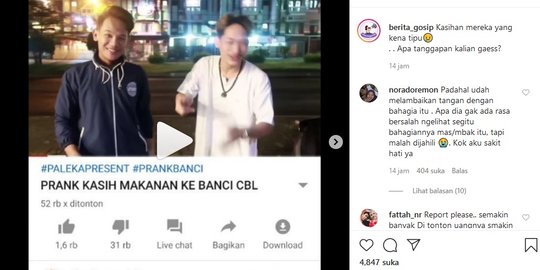 Diketahui paket sembako tersebut hanya berisi sampah dan batu. Video itu diunggah Ferdian bertajuk 'Prank Kasih Makanan Ke Banci CBL' di kanal Youtubenya dan sudah ditonton puluhan ribu orang. Video prank tidak terpuji itu viral dan menjadi obrolan warganet sejak Minggu (3/5) kemarin.