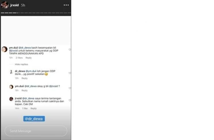 Sementara itu, melalui Instagram Storiesnya, Jerinx mengungkapkan awal mula tantangan tersebut. Hal ini bermula ketika ada seorang netizen yang menandai Dokter Dewa untuk mempertemukan Jerinx dengan pasien ODP.