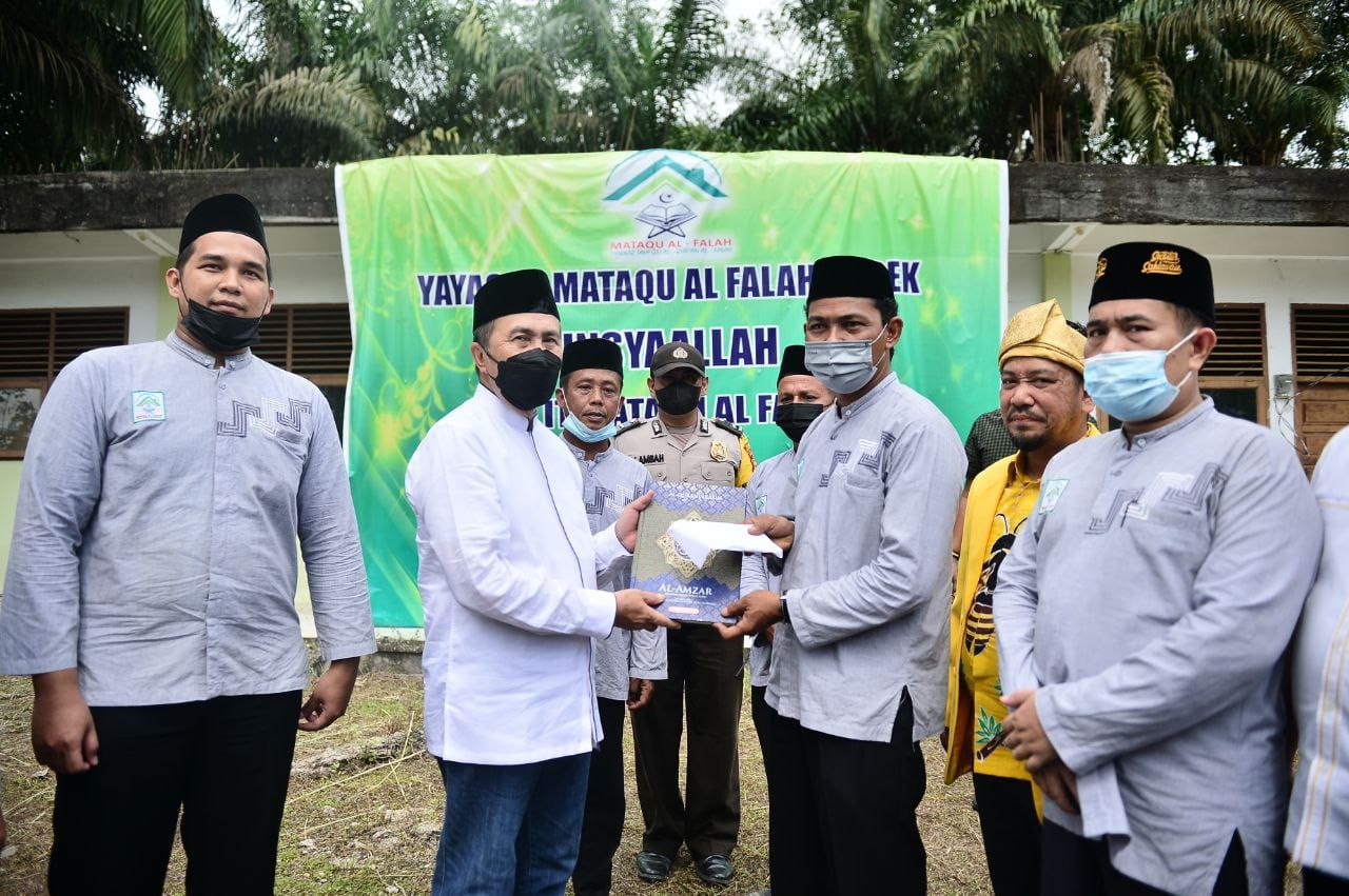 Pada kesempatan tersebut Gubernur Riau Juga menyerahkan bantuan uang tunai serta bantuan Al-Quran kepada yayasan Mataqu Al-Falah Sorek.