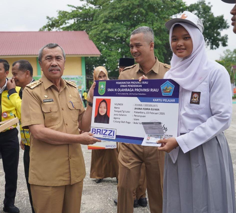 Riauaktual.com - Gubernur Riau (Gubri), Syamsuar launching kartu pelajar dan kartu pegawai berbasis uang elektronik atau e-money di SMAN Olahraga (Smanol) Provinsi Riau, Selasa (14/3/2023).