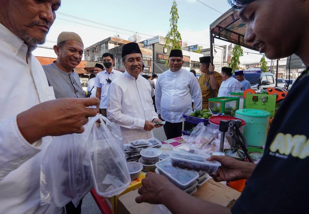 Kedatangan orang nomor satu di Provinsi Riau tersebut menjadi berkah bagi para pedagang. Tampak Gubri Syamsuar langsung memborong takjil dari para pedagang.
