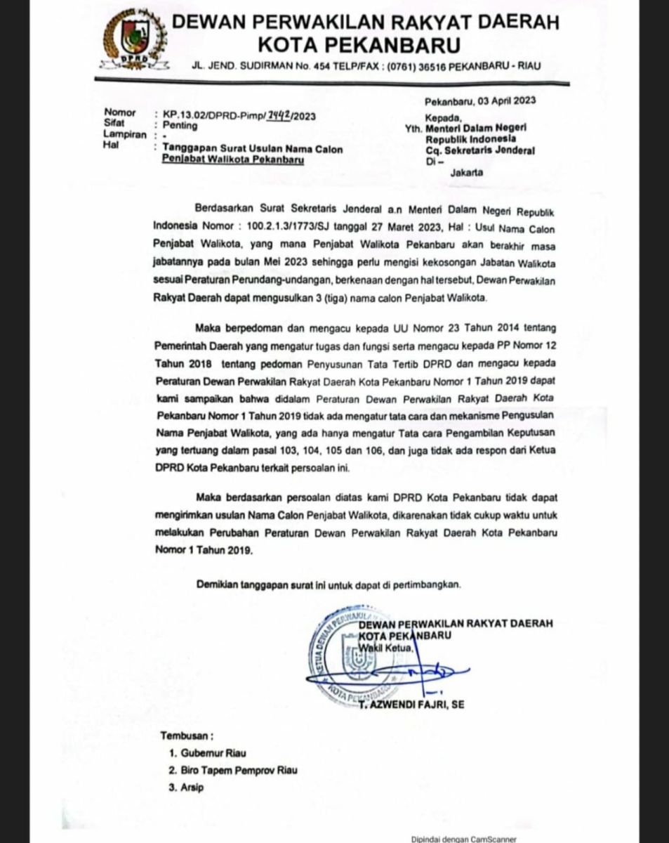 Riauaktual.com - Hingga Kamis (6/4) malam sesuai batas akhir yang telah ditentukan DPRD Kota Pekanbaru tak juga mengusulkan nama-nama calon penjabat (Pj) Wali Kota Pekanbaru sesuai arahan dari Menteri Dalam Negeri (Mendagri).