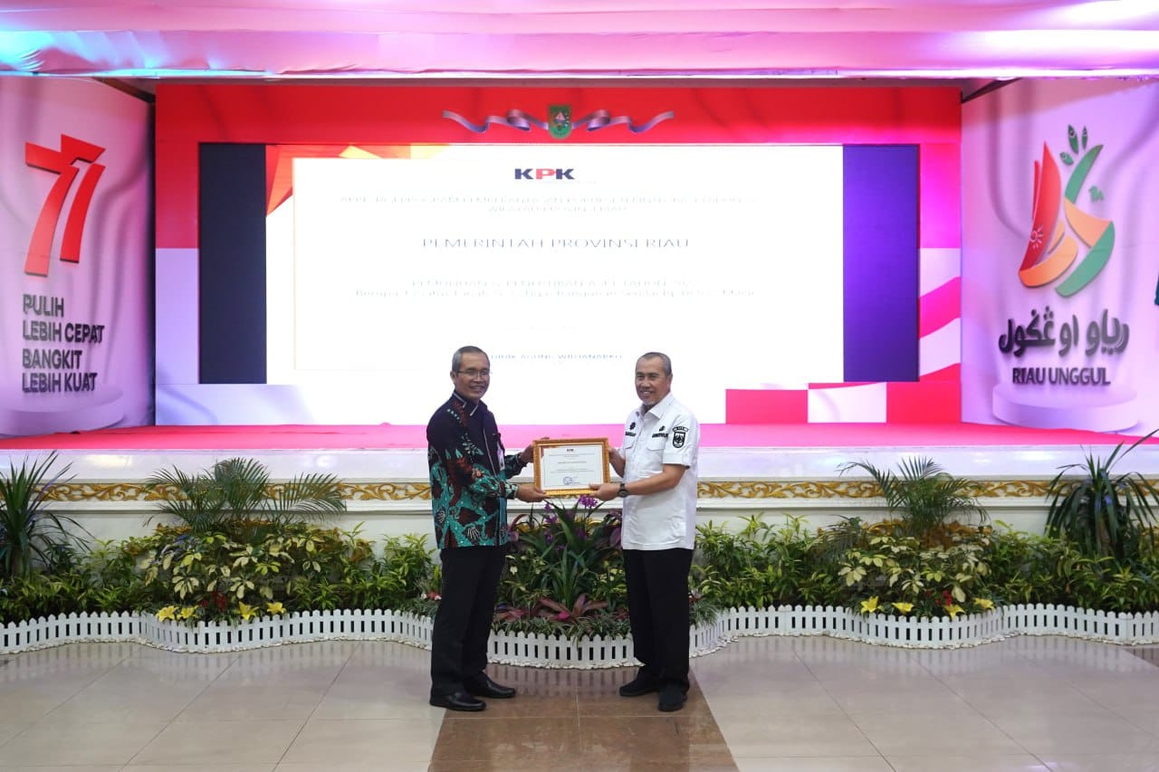 Penghargaan tersebut diserahkan langsung oleh Wakil Ketua Komisi Pemberantasan Korupsi (KPK), Alexander Marwata kepada Gubernur Riau (Gubri) Syamsuar di Gedung Daerah Balai Serindit, Rabu (24/5/2023).