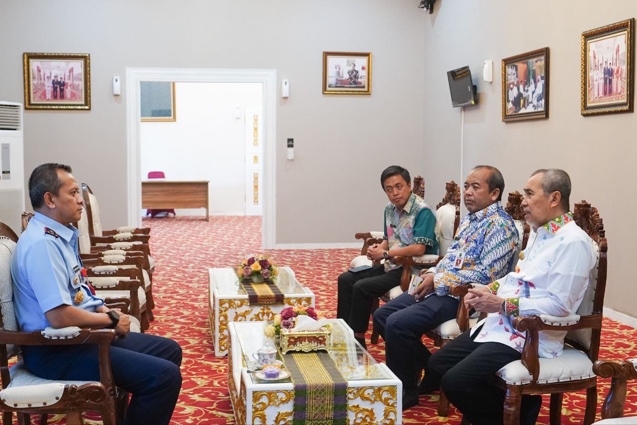 Riauaktual.com - Gubernur Riau (Gubri) Syamsuar menerima silaurahmi Komandan Lanud Roesmin Nurjadin Marsma TNI Mohammad Nurdin di Kediaman, Kamis (25/5/2023).