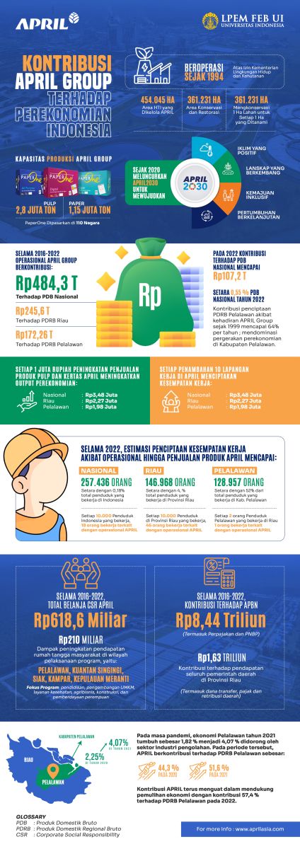 Dalam skala nasional, riset LPEM FEB UI menunjukkan bahwa efek multiplier operasional APRIL Group berkontribusi dalam penambahan Produk Domestik Bruto (PDB) sebesar Rp484,3 triliun selama periode 2016-2022.